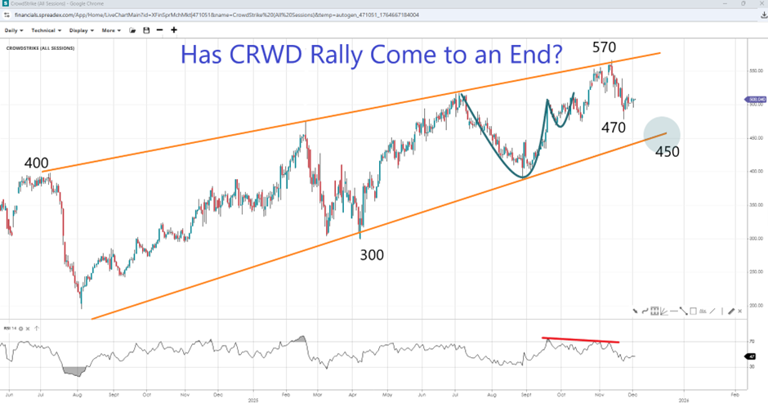 CRWD stock has come off its record high of $570 per share recently after forming consecutive momentum divergence signals, bringing into focus the $500 handle. Despite a medium-term cup-and-handle formation, the measured move projection does not appear to have materialised or likely to do so, given that prices have reverted back to the neckline. If bulls fail to hold the area formed near $470, all eyes will shift to the $450 level, given its proximity to the lower trendline of a potential terminal wedge pattern. Losing that bottom will expose $400 and ultimately the $300 round support. Alternatively, holding the short-term support or bouncing off the trendline could see CRWD attempt to reclaim record highs.