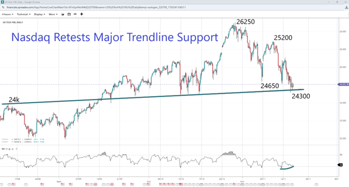 Nasdaq has fallen around 7.50% to 24300 from its record peak of 26250, bouncing off a major trendline connecting the late-summer record high to the September and October troughs in the 24200–24400 range. With RSI supporting short-term upside while remaining above the 30 line, reclaiming the 24650 resistance could open the door to 25200. However, if the bulls struggle to get through 25k, prices might head back towards 24k, bringing Nasdaq closer to an official correction at 23625, 10% under its peak.
