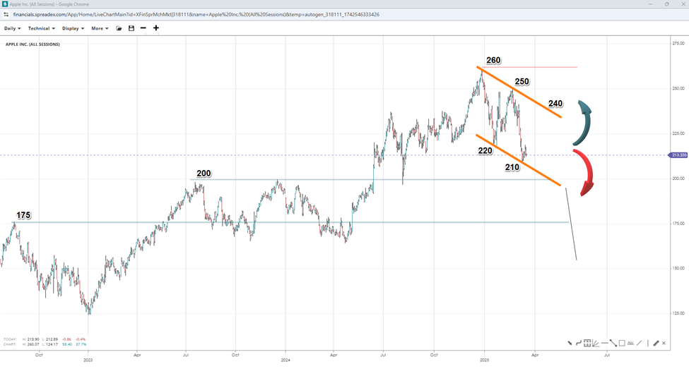 Apple faces short-term challenges, such as potential effects from tariffs, currency headwinds, and hurdles in implementing AI technologies. Still, its affluent customer base and positive long-term trends in its flagship products and cloud services provide optimism for a resurgence. Technical analysis signals a potential upside move, though it still suggests a potential breakdown towards $150 if the $200 support level fails to hold.