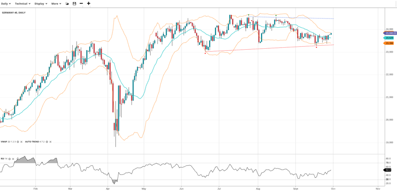Germany 40 remains in a sideways trend, trading at 23,840, just above its VWAP of 23,629 after rebounding off range support. The RSI at 53.2 suggests mild upward momentum. Support is at 23,396, with resistance at 24,000.