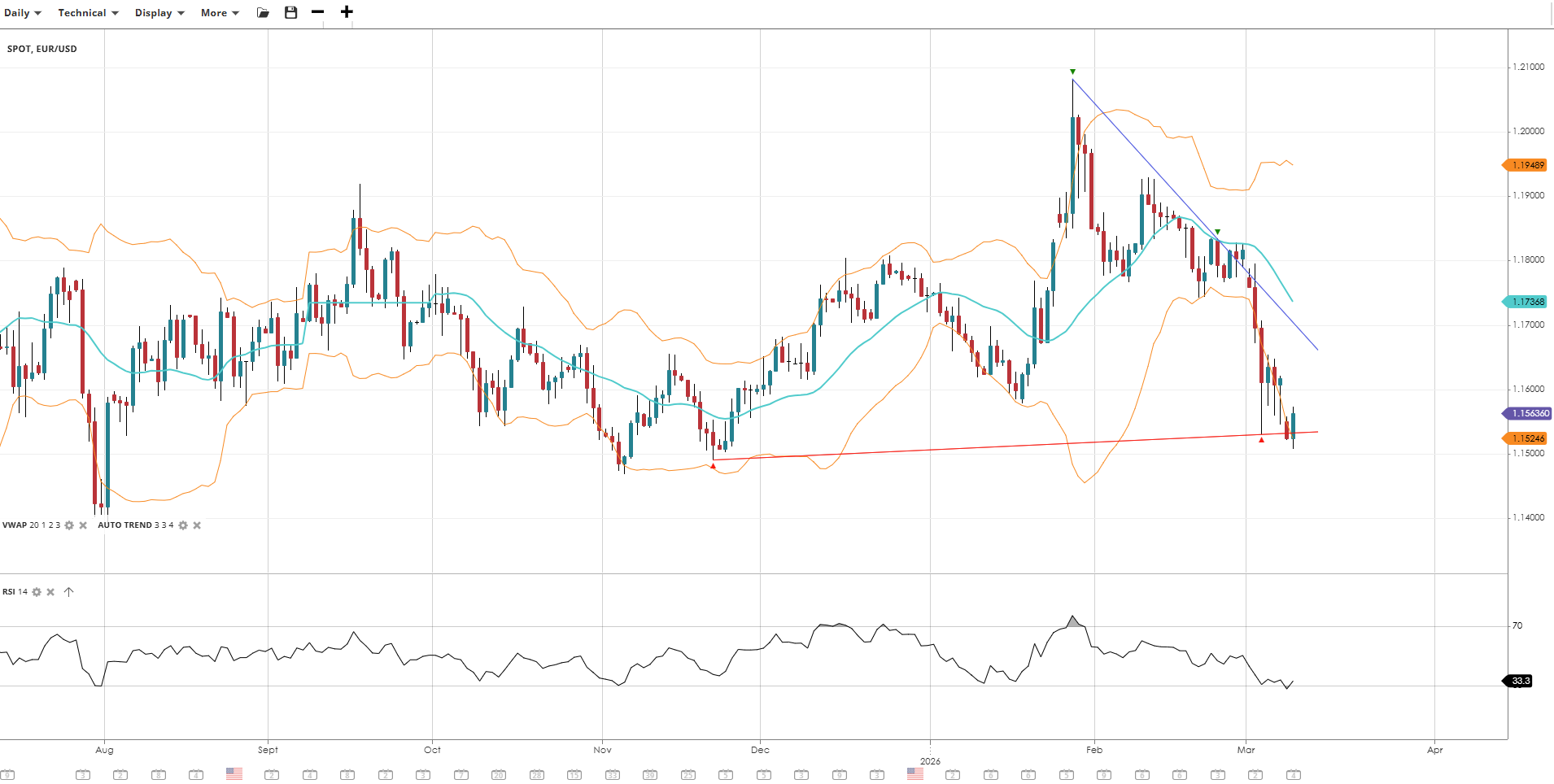 USD/JPY has shifted into a more bullish setup, but still within its sideways range with breaking back above the VWAP but below YTD highs. Momentum is strengthening, with RSI pushing higher as the pair recovers from its February lows and approaches key resistance near the upper standard deviation band.