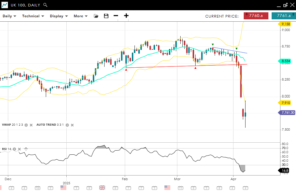 UK 100 is now well into a bearish trend, breaking down from its prior consolidation. The index trades at 7,761, well under the 20-day VWAP of 8,534. RSI stands at 16.8, deeply oversold, reflecting strong bearish momentum. Support is marked at 7,910, with resistance far above at 9,158.