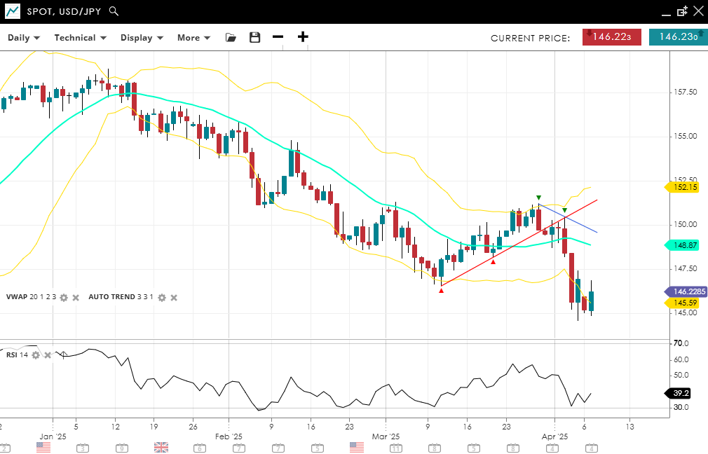 USD/JPY remains bearish and is in a short-term corrective bounce off the lows, currently at 146.22 and below its VWAP of 148.87. RSI at 39.2 is weak but not oversold. Support is pegged at 145.59, with resistance coming in at 152.15 should sentiment shift.