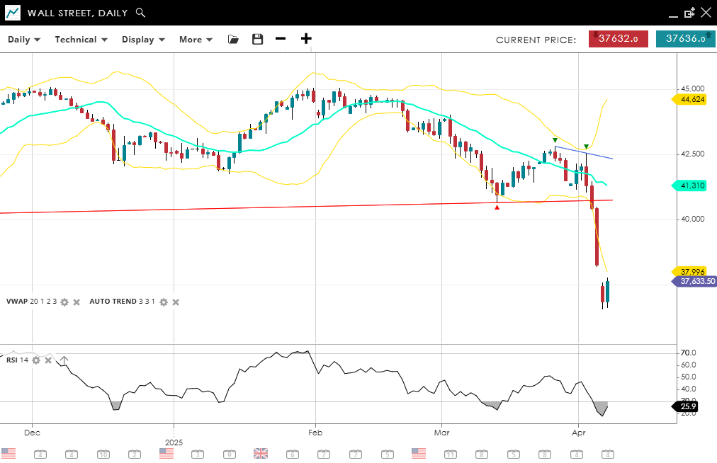 Wall Street remains in a strong bearish trend, continuing its impulsive decline. It currently trades at 37,632, far beneath its 20-day VWAP of 41,310. The RSI is at 25.9, confirming oversold status. Key support sits at 37,996, while initial resistance is now at 44,624, a long way off.