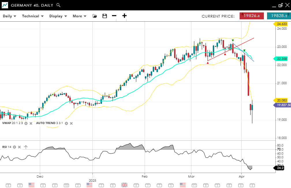 Germany 40 has decisively shifted into a bear market. It trades at 19,826, well below its 20-day VWAP of 22,358. The RSI has plunged to 24.2, indicating oversold conditions and continued downward pressure. Immediate support at 20,083 has already been taken out, while a move above resistance at 24,633 would be needed to signal any meaningful recovery.