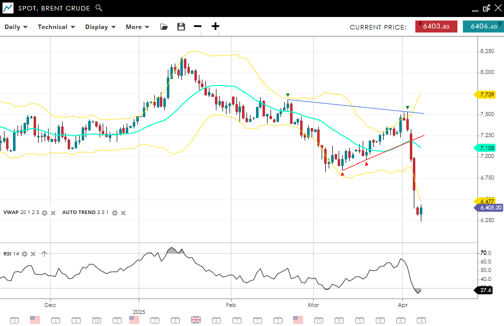 Brent Crude has entered an impulsive bearish phase, with price collapsing to 6,403—sharply below the VWAP of 7,108. The RSI has dropped to 27.6, pointing to newly oversold territory that supports the bearish momentum. Immediate support lies at 6,477, and any upside attempts face resistance near 7,739.