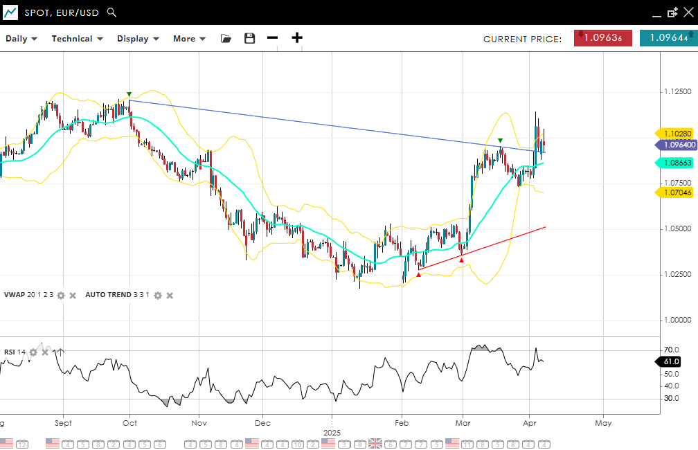 EUR/USD holds its bullish bias but is in a corrective dip, trading at 1.096, slightly above its 20-day VWAP of 1.0866. RSI reads a constructive 61.0 but showing bearish divergence across the last two peaks. Support is nearby at 1.0705, while resistance is seen at 1.1028 for continuation.