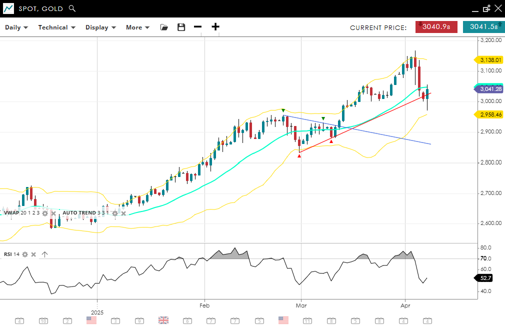 Gold remains bullish overall but is undergoing a pullback. Price is now at 3,040, right on its 20-day VWAP of 3,041. The RSI at 52.7 suggests stabilisation, but with lessened momentum. Support is seen at 2,958, with resistance near the previous high at 3,138.