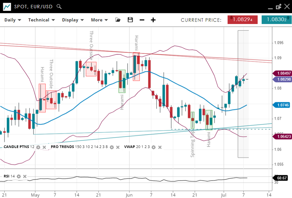 EUR/USD has broken out from its previous downtrend but the new uptrend needs to take out the June high to be sustainable. It is now well above the VWAP of 1.0746. Support has adjusted higher to 1.06423, while resistance has increased to 1.08497. The RSI has increased to 60.67, indicating a reduction in bearish pressure.
