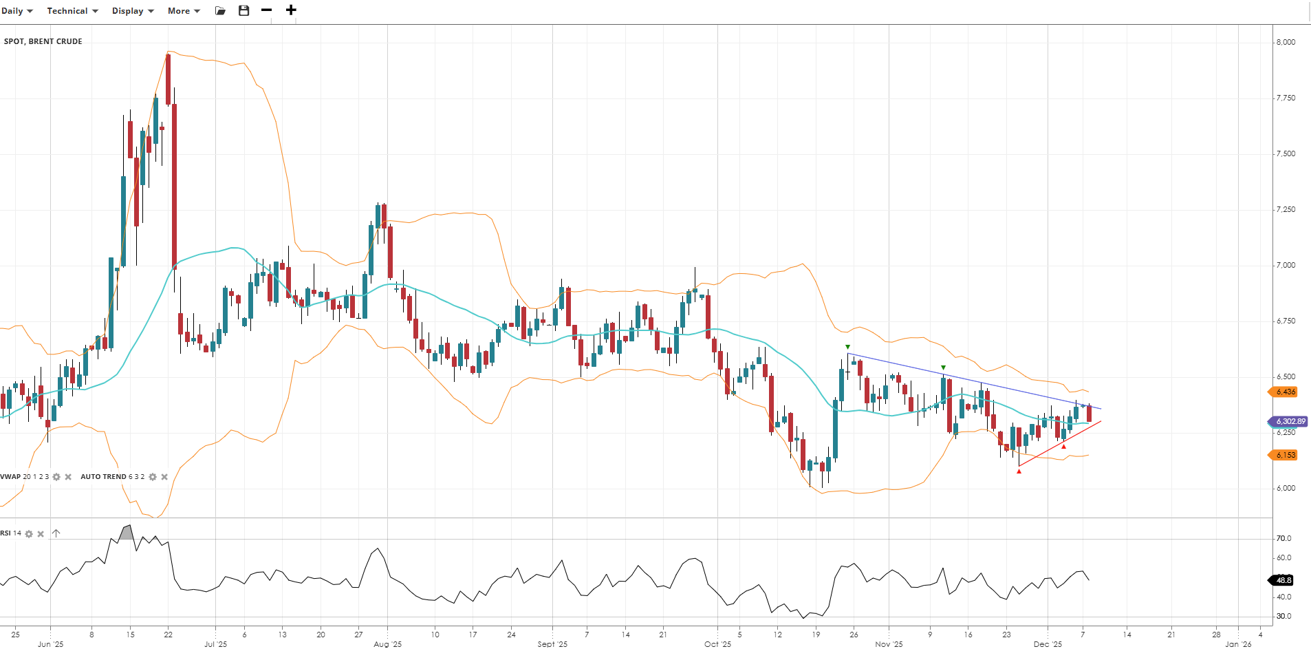 Brent Crude is still trading sideways with a slight bias lower. Price is 6,303, sitting just under the VWAP of 6,436. RSI at 48.9 shows muted enthusiasm. Support is at 6,153 and resistance at 6,436.