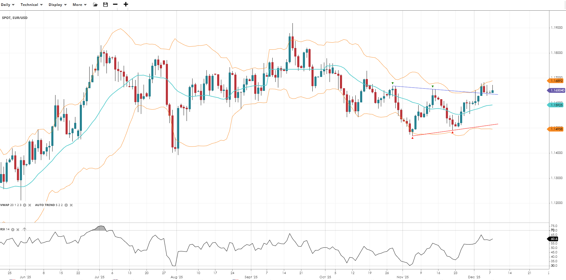 EUR/USD sits at the top of its short term range, in the middle of its longer term sideways range. It trades at 1.1650, above the VWAP at 1.1592. The RSI at 60.0 confirms strengthening momentum. Support is at 1.1500, with resistance at 1.1693.