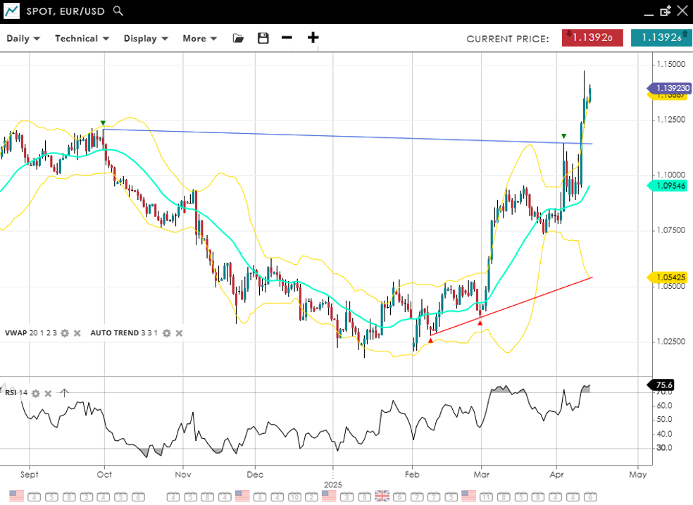 EUR/USD is surging in a bullish impulsive phase, trading at 1.1392 and significantly above its VWAP of 1.0955. RSI is elevated at 75, indicating overbought territory and scope for some kind of consolidation. Support is located at 1.0543, and price is currently testing resistance at 1.1392.