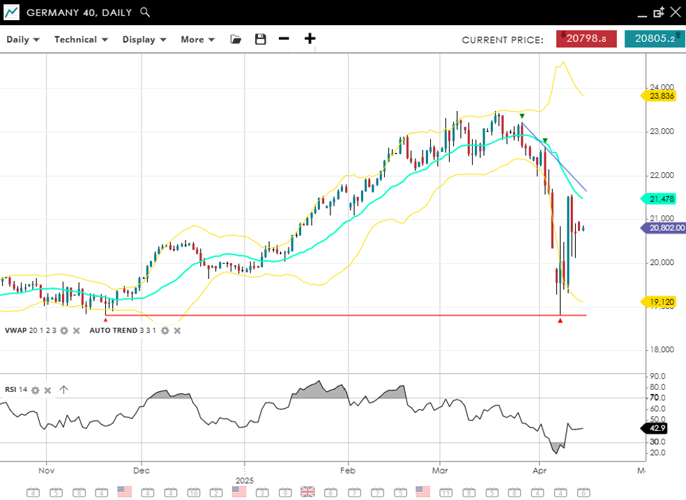 Germany 40 remains in a bearish market but has entered a correction following last week’s big turnaround. It is trading at 20,805, still below its 20-day VWAP of 21,478. The RSI at 43 suggests weak momentum, but not extreme oversold conditions. Support is in place at 19,120, while a breakout above resistance at 23,836 would be needed to challenge the current trend.