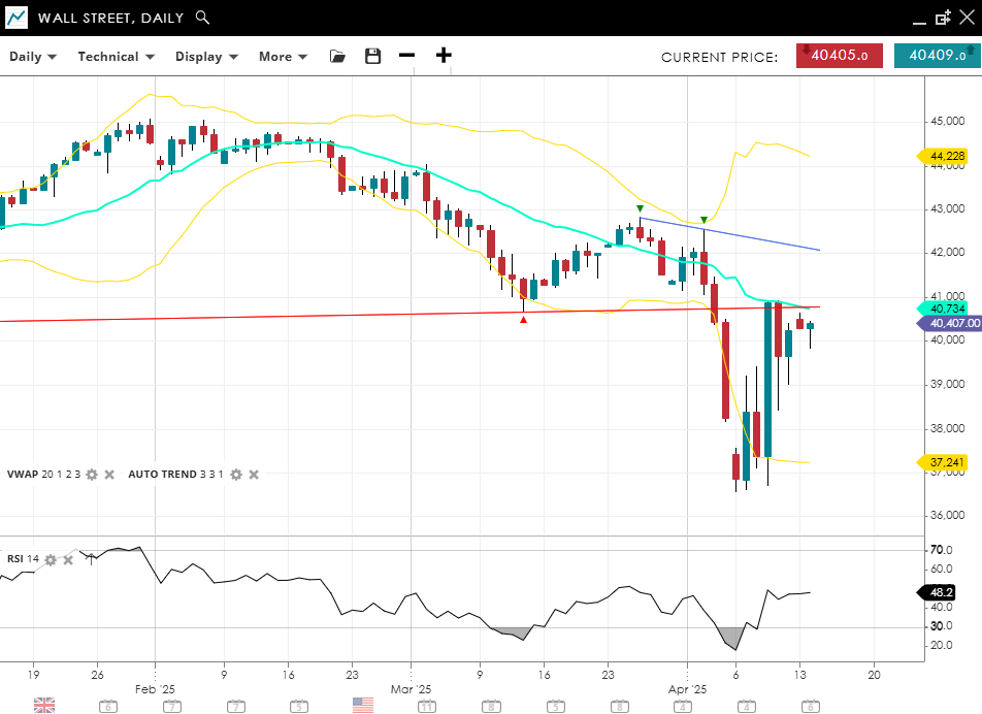 Wall Street continues to correct within a broader bearish trend. It trades at 40,409, slightly below the VWAP of 40,734. RSI at 48 indicates neutral momentum, showing signs of consolidation. Key support is found at 37,241, while resistance stands at 44,228.