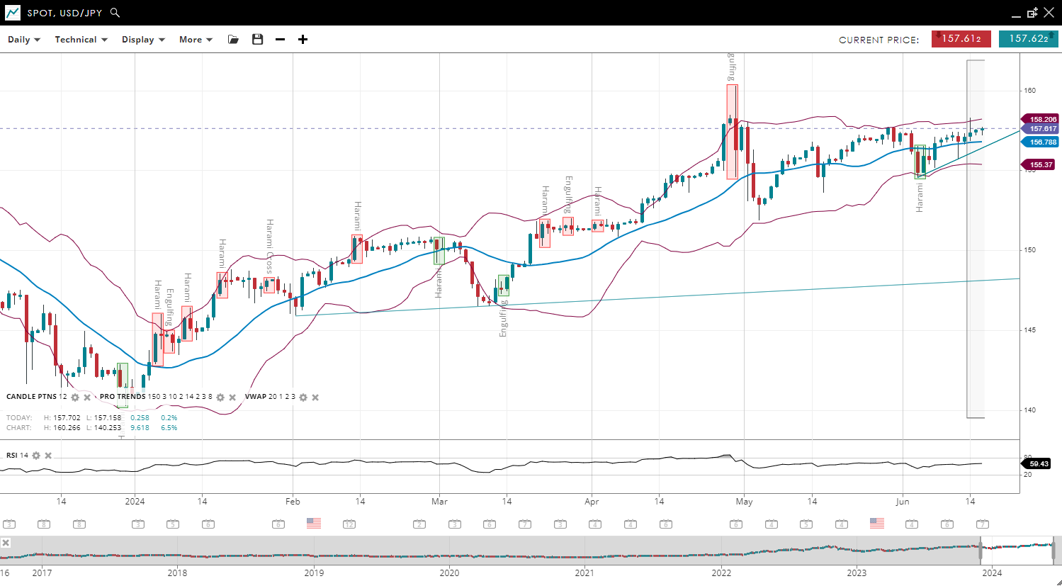 | USD/JPY | Bullish | Impulsive | 157.61 | 156.78 | 155.37 | 158.20 | 59 |