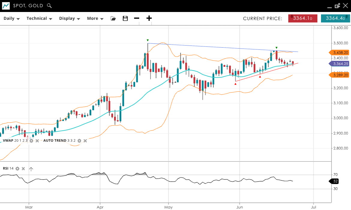 Gold remains bullish but is now in a correction/sideways phase. It trades at 3,364, very close to its VWAP of 3,360. The RSI at 52 implies a neutral to slightly bullish sentiment. Support is at 3,289, with resistance at 3,438.