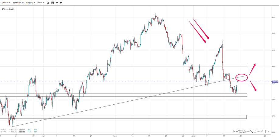 The SPX 500 found support at 3840 and bounced in an attempt to retest the ascending trendline near 3930. A move above there exposes the 4000 handle and opens the door to 4100. If bullish momentum wanes below the support, 3700 is a crucial stronghold above the low of 3635.