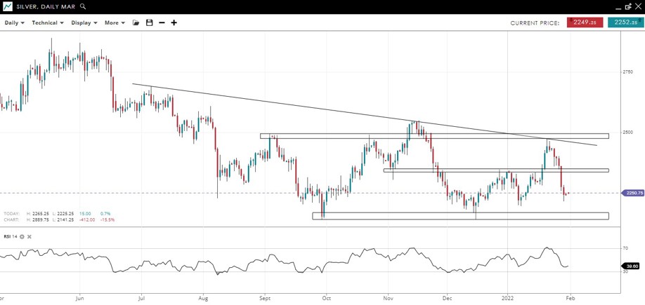 The price bounced strongly off range support at 14,900. A breakdown under 14,900 could open up a quick drop towards 14,000.