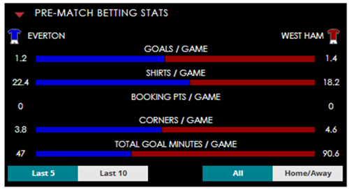 To see all the Everton v West Ham betting stats and form, visit our pricing page to view our Pre-Match betting stats table or hover over/tap the chart image to see previous outcomes for that particular market.