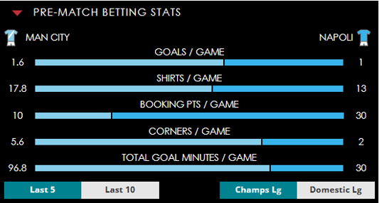 To see all the Manchester City v Napoli betting stats and form, visit our pricing page to view our Pre-Match betting stats table or hover over/tap the chart image to see previous outcomes for that particular market.