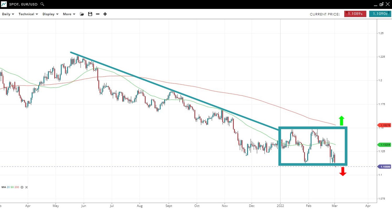 EUR/USD has been down-trending for the best part of a year but as of 2022 is consolidating inside a clear box pattern with a ceiling at 1.15 and a floor at 1.11. Whichever of these breaks, will likely determine the medium-term direction for the forex pair.