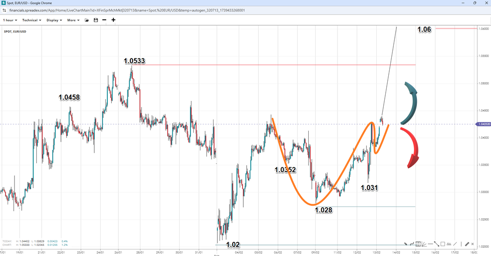 EURUSD encountered resistance at 1.0444 after completing a potential bullish cup and handle (C&H) pattern, signalling a measured move towards the 1.06 handle. If the pair breaks past the neckline of the pattern, resistance lies at 1.0458 and 1.0533. However, a rejection at the peak could form a double top, potentially opening the door to 1.0352 and the 1.31 swing. On the downside, a break below 1.028 would expose the 1.02 round support.