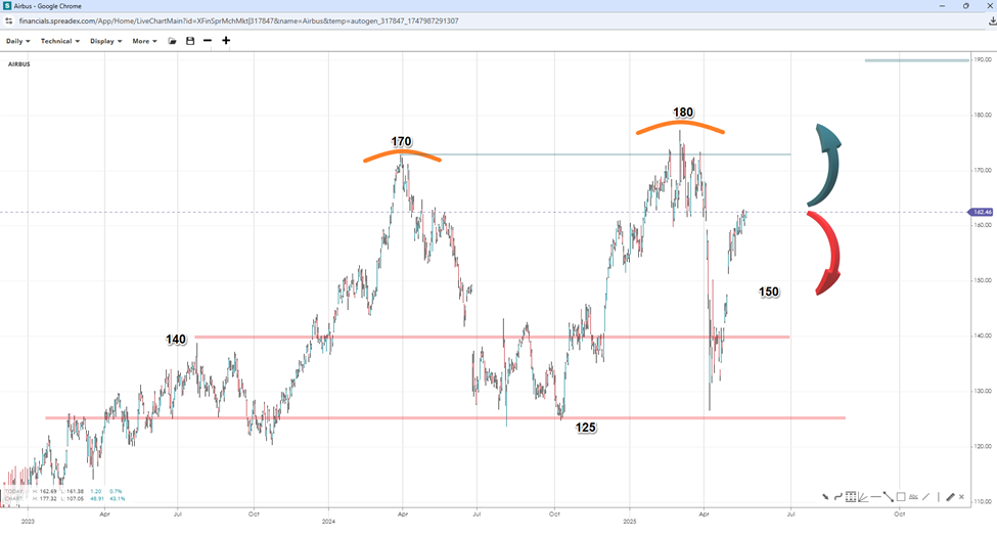 Airbus has found support at €125, forming a potential neckline support, which could set the stock up for a short-term upside to €170 if a head-and-shoulders pattern emerges. A move past the peak of €180 would imply a double bottom at €125, opening the door to record highs at €190 and €200. However, a rejection at the top could signal a potential continuation of the large range or even form a triangle or pennant chart pattern. If prices reverse prematurely, support levels lie at €150 and €140 before reaching the bottom again.