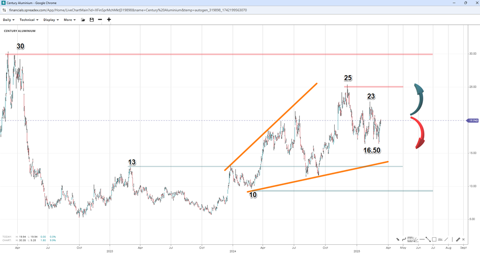 Century price action shows a potential consolidation as part of a potential broadening wedge, suggesting a likely continuation towards $30 once the correction pattern completes. Between current prices and $30, resistance sits at $23 and $25. Conversely, a breach of the $16.50 support might trigger a drop below the lower wedge trendline, exposing the stock to a deeper decline towards $10. Higher support lies at the $13 level.
