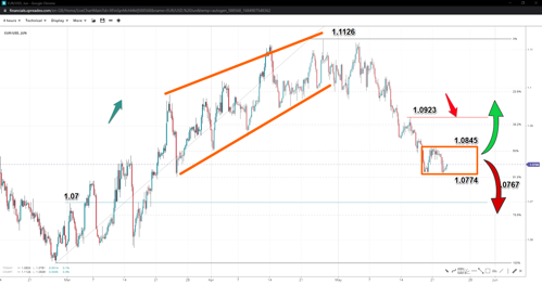 The wedge pointing to $1.1126 has proven detrimental to the price of EUR/USD as the exchange rate has dropped substantially since, forming a double bottom to $1.0774 as of yesterday, Tuesday. If the typical pre-event price action were to play out, the pair might consolidate until the minutes offer more clarity and a breakout or breakdown.