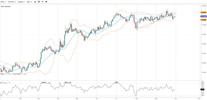 EUR/USD has dropped back into its range after a failed breakout. It is trading at 1.1726, slightly below its VWAP of 1.1750. RSI at 49.9 indicates a neutral stance. Support is at 1.1638, with resistance at 1.1832.