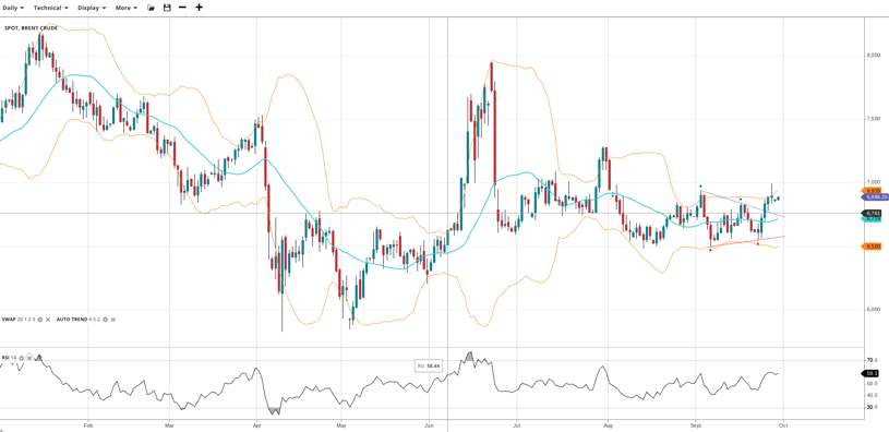 Brent Crude is in the same choppy range-bound conditions with reduced volatility from weeks prior, trading at 6,886, above its VWAP of 6,719. The RSI of 59.1 suggests moderate strength. Support is found at 6,500, and resistance is at 6,939.