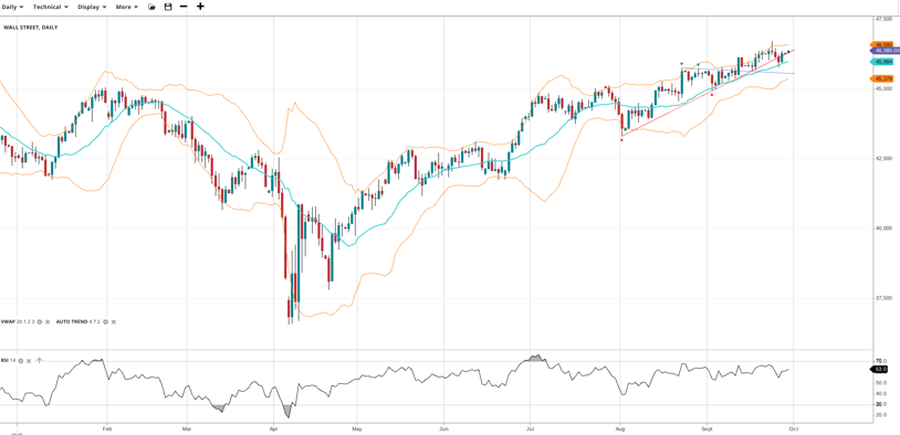 Wall Street remains in a bullish impulsive phase, trading near record highs at 46,380, above its VWAP of 45,984. The RSI at 63.0 supports strong bullish sentiment albeit not overbought. Support sits at 45,379, with resistance at 46,590.