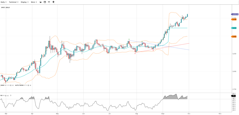 Gold is maintaining its epic bullish impulsive phase, trading above the 3800 handle for the first time at 3,806, well above its VWAP of 3,613. The RSI at 79.1 indicates extreme overbought levels. Support is at 3,492, and resistance is at 3,734.