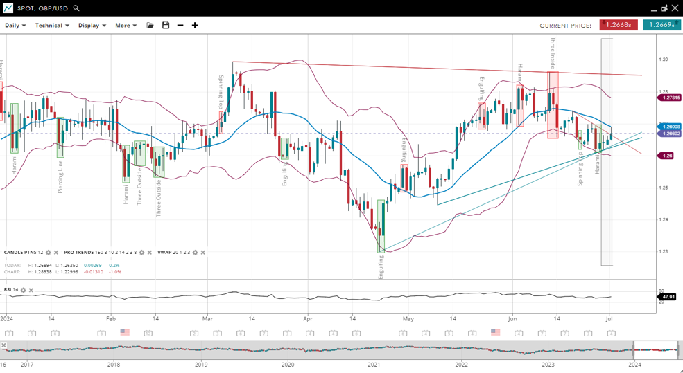 EUR/USD remains broadly trendless with the price more recently increasing to 1.0755, now slightly above the VWAP of 1.0729 - and indicating a possible new phase of weakness. Support has adjusted higher to 1.0664, while resistance has decreased to 1.0793. The RSI has increased to 51, indicating a reduction in bearish pressure compared to the previous report.
