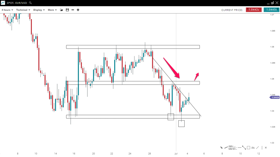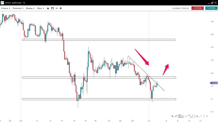 After breaking the parallel channel to the downside, Cable found buyers near the 1.20 mark and reversed higher. The market showed good positive momentum which could lead to a break of the bearish trend line to the upside. If this scenario occurs along with a close above the pivot level (1.21), this could lead to a move higher toward the 1.24 mark.