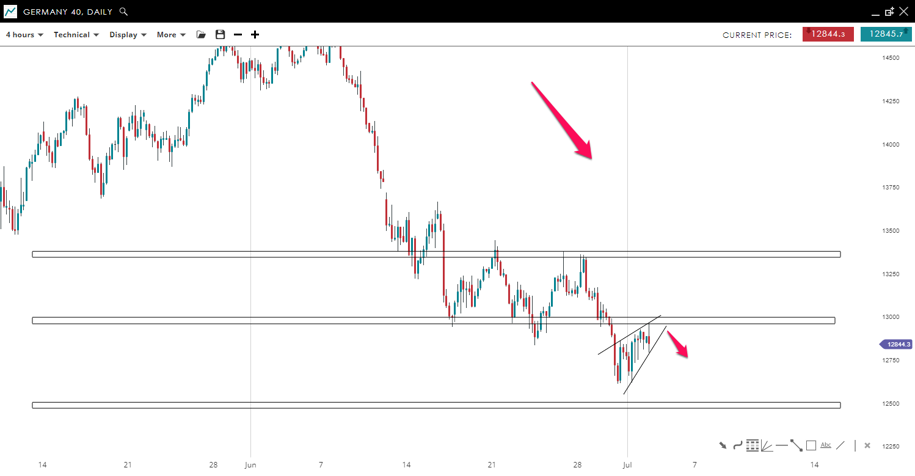 Sellers are in clear control of the market where lower lows and highs have been posted. We have seen a strong upwards correction in the form of a rising wedge pattern. A double top has been left just above 3900, which led to a reversal and a move lower. In addition, the price managed to break the wedge pattern to the downside which is a sign of strength from the sellers. Further movement to the downside could be seen toward the 3,645 mark.