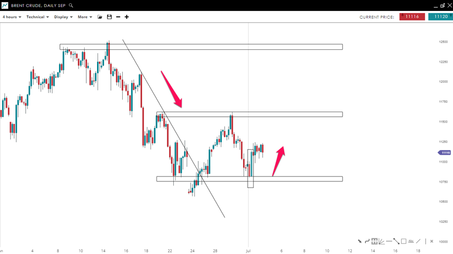 Brent Crude Oil is currently traded inside a parallel channel formation which is made of a key strong support and resistance level with the following price values: 107 & 115. The market posted an engulfing bullish pattern near the lower end of the range which led to a reversal and a move higher. This move to the upside might continue all the way up toward the June high at 124.