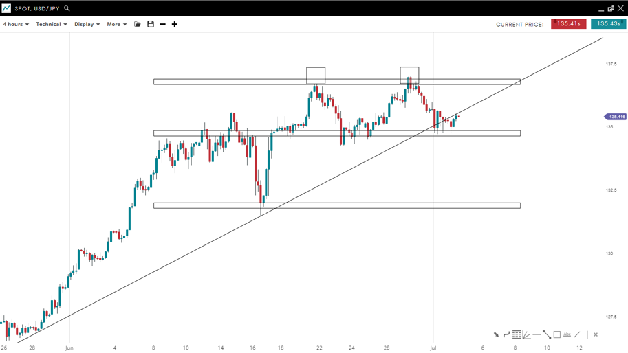 The price of “USD/JPY” has entered into a sideways range after an aggressive move to the upside. The asset posted a double top formation near a strong resistance level which led to a reversal and move to the downside. The Dollar-Yen successfully broke the bullish trend line to the downside which indicates that the sellers are in control of the market. A break and close below the pivot level (134), could see the “USD/JPY” reach 131, the June 16 low.