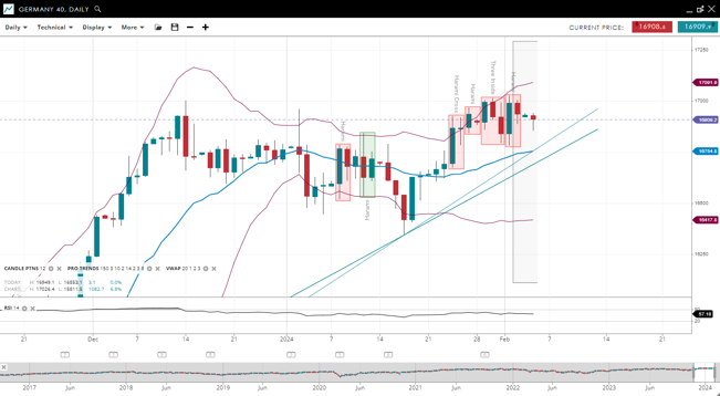 Germany 40 is currently in the impulsive phase of a bullish trend, with the price above its 20-period VWAP of 16,754. The index finds support at 16,417 and faces resistance near 17,091. The RSI stands at 57, indicating a positive momentum but not yet overbought.