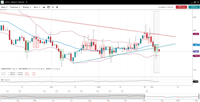 Brent Crude is in the impulsive phase of a bearish trend, with its price below the 20-period VWAP of 79.48. The support level is at 75.33, with resistance near its current price at 83.64. The RSI is at 41, indicating bearish momentum with potential for further downside.