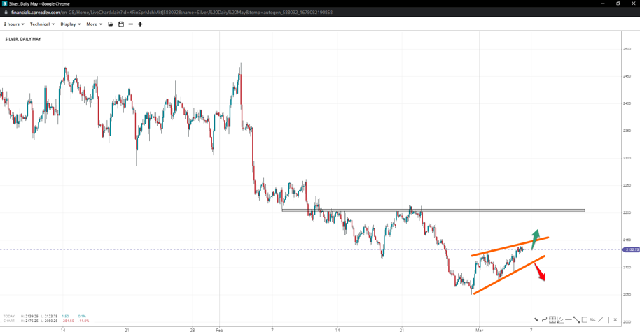 Gold bears failed to extend to the round support of 1800,  with bulls taking the opportunity to engage in short-covering to 1864. If the resistance holds, the commodity could fall to 1827 and form a flag or pennant as it moves impulsively higher. However, a break past it might see added upside bias towards 1900, with 1873 a likely resistance.