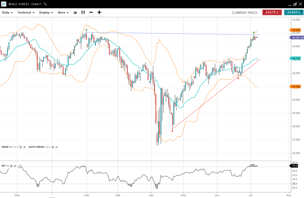 Wall Street continues its bullish trend and is in an extended impulsive phase, trading at 44,681, significantly above its VWAP of 43,119. This highlights ongoing upside strength. The RSI at 72 suggests the market has entered overbought conditions. Support is seen at 41,002, with resistance at 45,236.