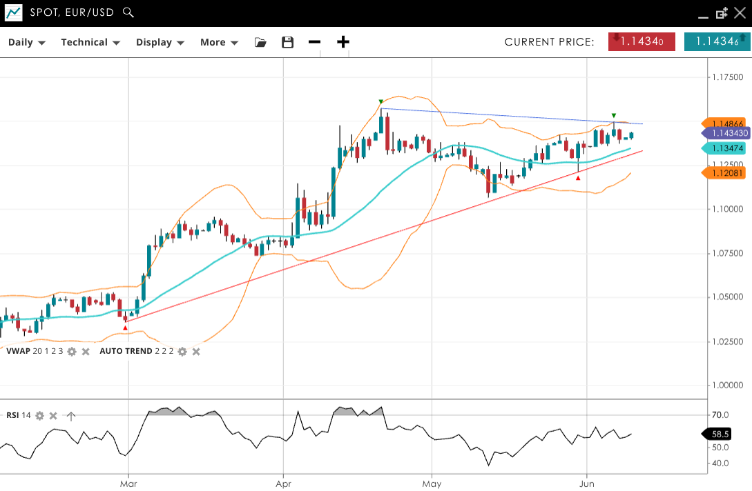 EUR/USD is in a bullish trend but in a consolidation phase, trading at 1.1434, slightly above its VWAP of 1.1347. The RSI at 58.5 indicates steady buying interest. Support is at 1.1208, with resistance at 1.1486.