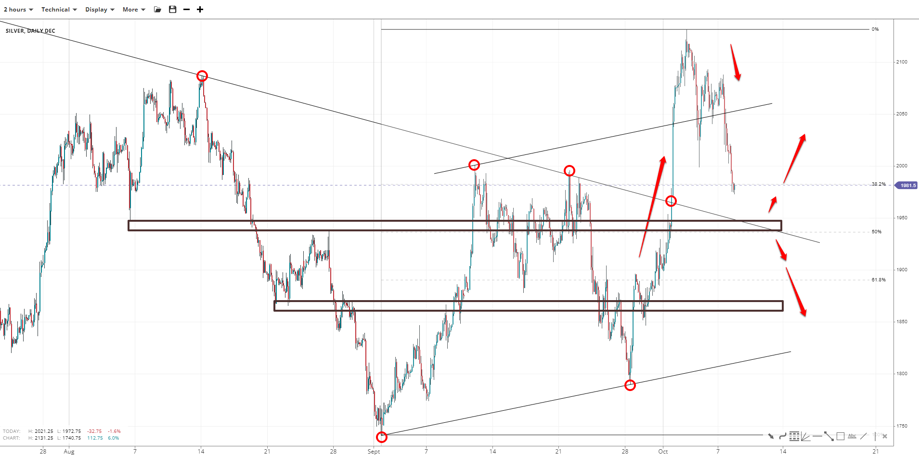 Silver rose above both the medium and short-term descending and ascending channels before returning to the 38.2% Fibonacci retracement of 17.40-21.30 near 19.80. Lower down lies the 50% and 61.80% retracements at 19.35 and 18.90. If the support holds firm, 20.00 comes back into focus, whether being the 38.20% or 50% Fibonaccis.