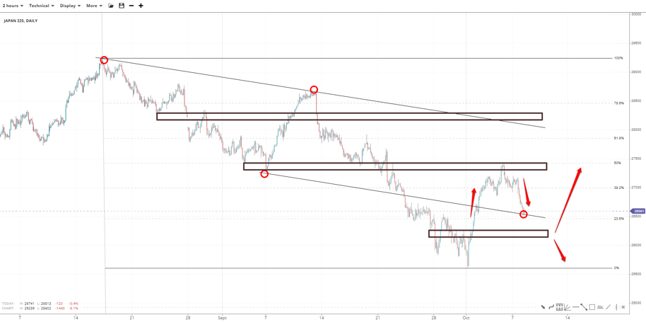 Japan 225 failed to reach the 50% Fibonacci of 29230-25600 near 27400 and slid below 27000 at 26560. Retesting the bottom channel might open the door back to the said resistances. Otherwise, a fall towards the 26200 support and the swing low of 25600 can be expected.