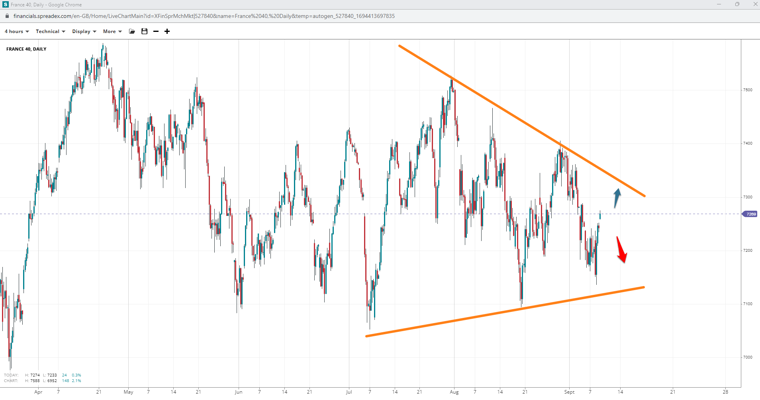 Higher lows and lower highs have formed a symmetrical triangle in France 40, with increasing chances at breaking past 7400. If prices slide, losing 7100 may invalidate the pattern, with 7k as the next significant support to watch.