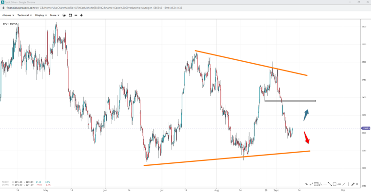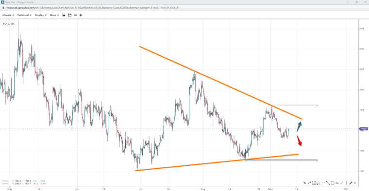 Gold may be in a triangle, too, unless $1980/oz is not the second peak, with bulls aiming at 2k. The pattern could get invalidated past $2020 an ounce, with declines targeting $1915/oz and perhaps $1900/oz.