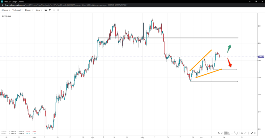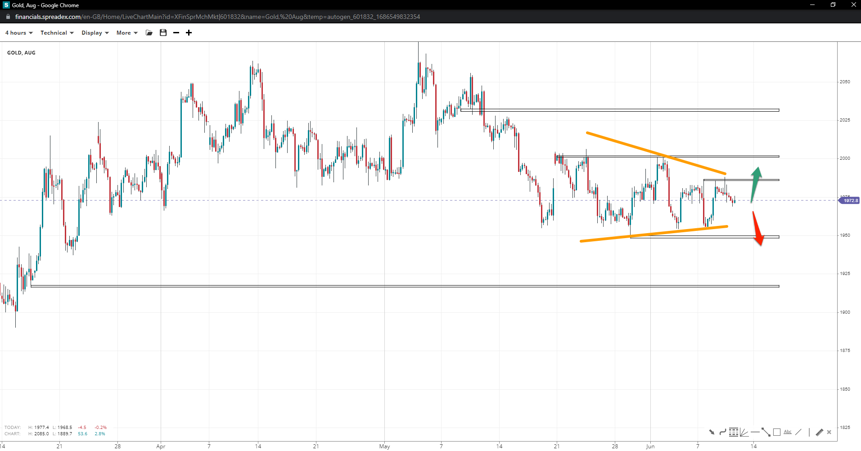 Gold’s continued consolidation resembles a triangle pattern which, if successful, could send prices dropping towards $1915/oz in the aftermath of a $1950/oz breakdown. A move past the double-top formation of $1985/oz could see a spike towards 2k but unlikely 2030/oz.