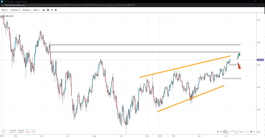 The SPX 500 could be heading towards the completion of a rising wedge pattern, with the previous peak of 4330 nearby. A break past it would expose 4390 but unlikely 4470. If the regional low at 4250 holds firm,  we might experience a consolidation, but a breakdown might clear the path to 4100 should 4200 succumb to potential pressure.