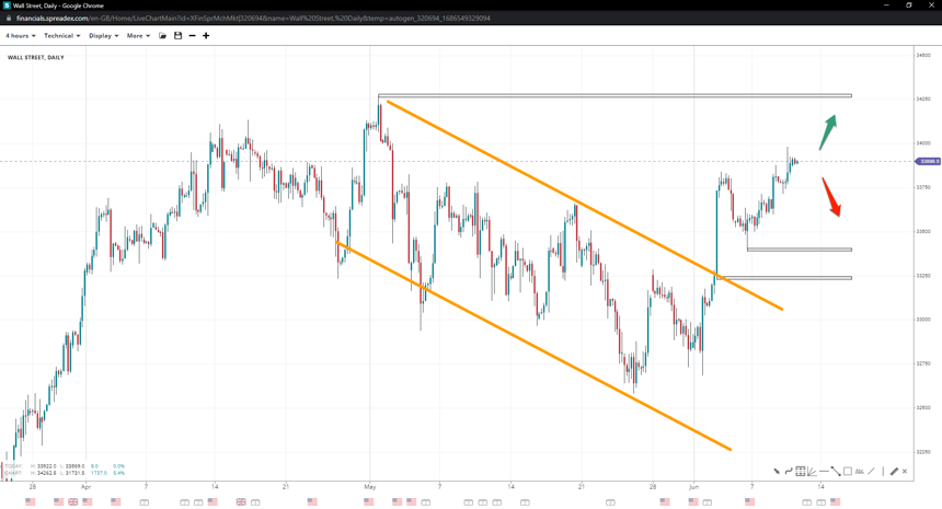 It seems that Wall Street has printed a flag at 32600 as the rising price action resembles an impulse. If bulls can reclaim 34k, we might see an attempt at 34500 should 34260 give in unless prices consolidate. On th4 flip side, 33300 is the first support to meet above 33250 in case of markets correcting first, with a slide below likely to see increasing interest towards 33k.